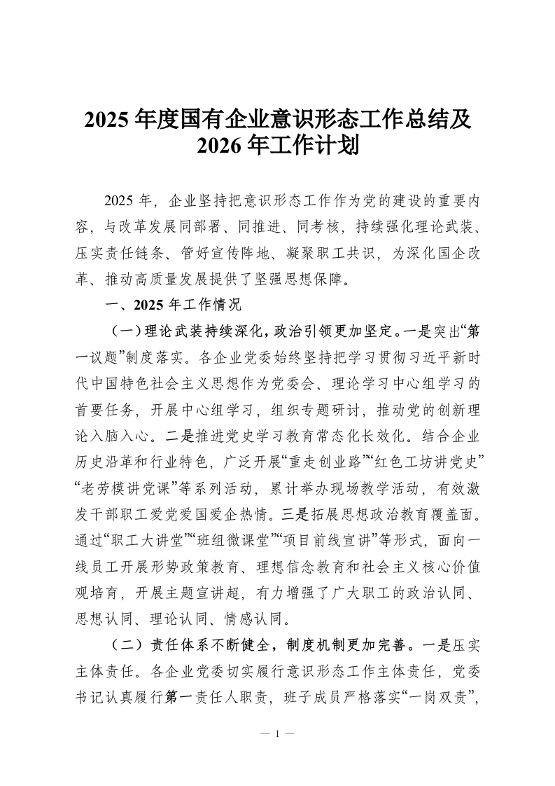 2025年度国有企业意识形态工作总结及2026年工作计划