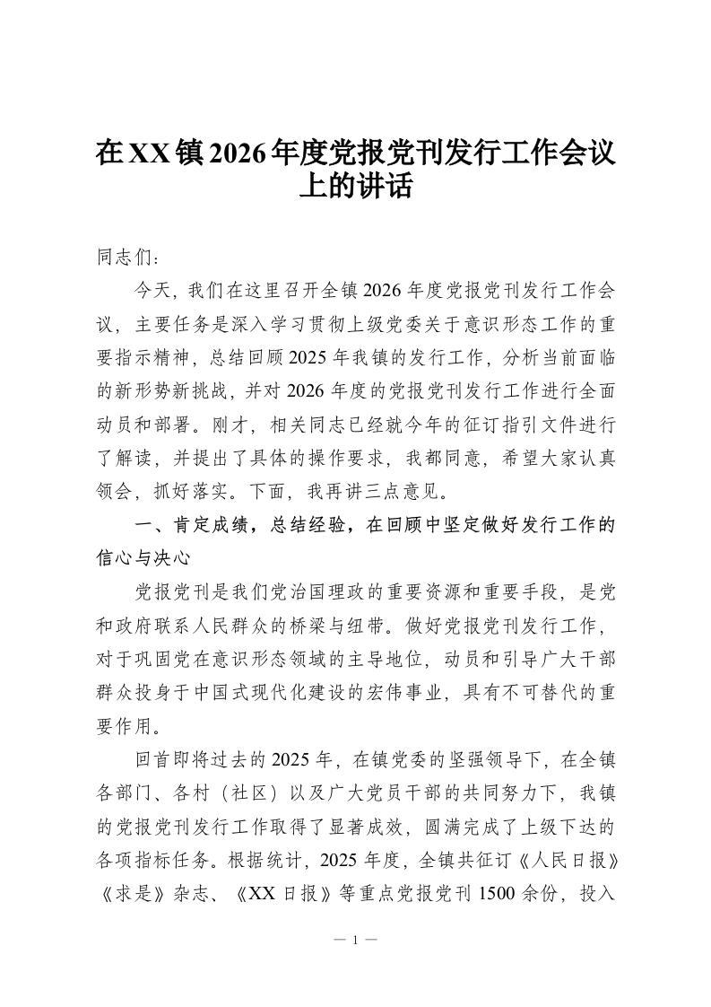 在XX镇2026年度党报党刊发行工作会议上的讲话