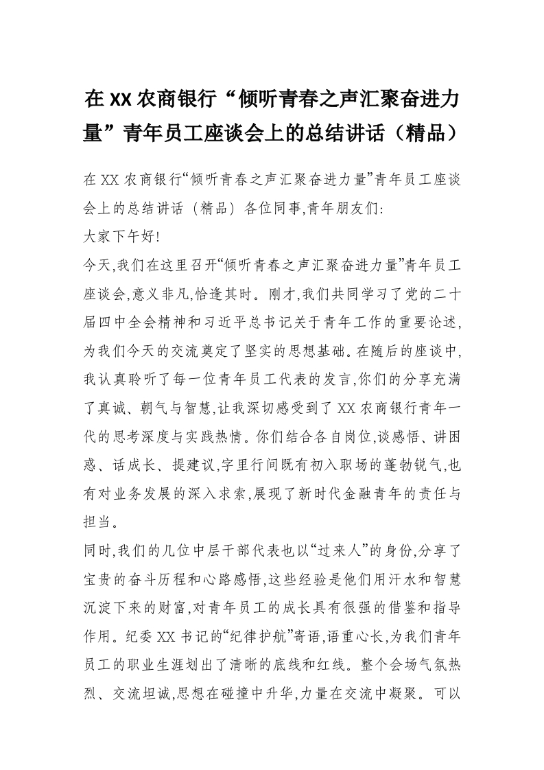 在XX农商银行“倾听青春之声汇聚奋进力量”青年员工座谈会上的总结讲话(精品)