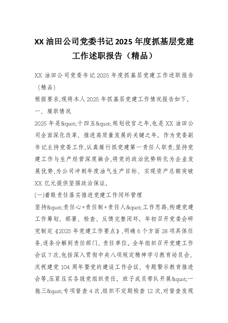 首页写作素材XX油田公司党委书记2025年度抓基层党建工作述职报告(精品)