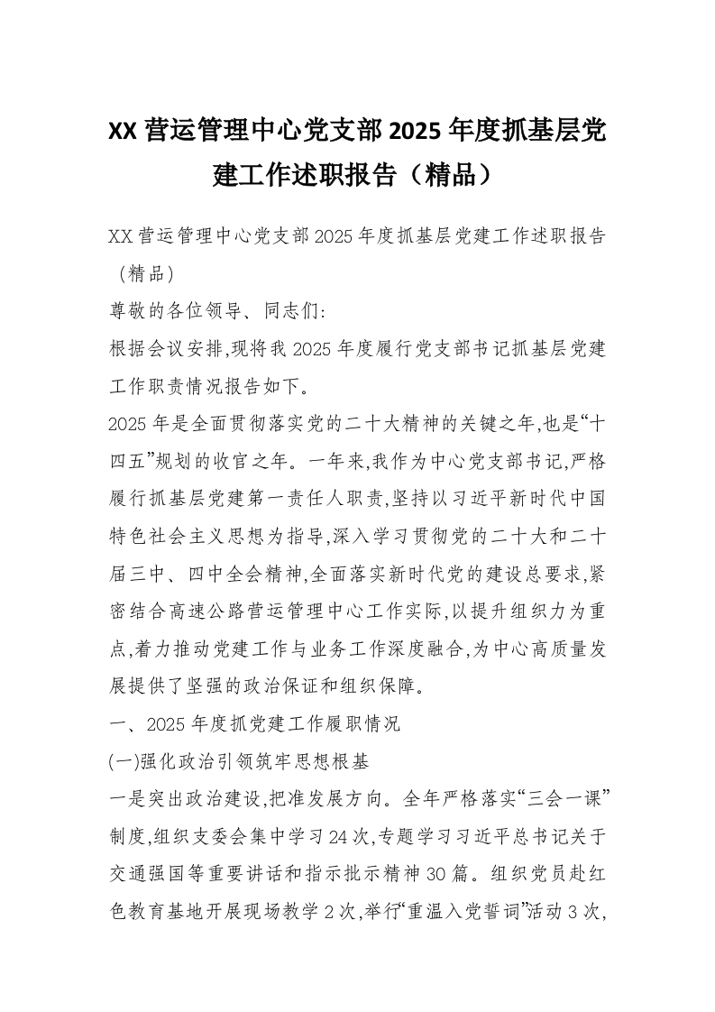 XX营运管理中心党支部2025年度抓基层党建工作述职报告(精品)