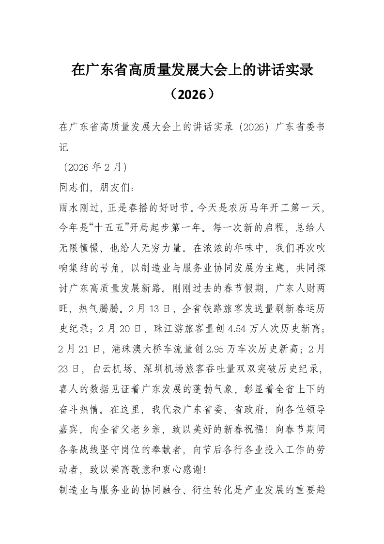 首页讲课讲稿在广东省高质量发展大会上的讲话实录(2026)