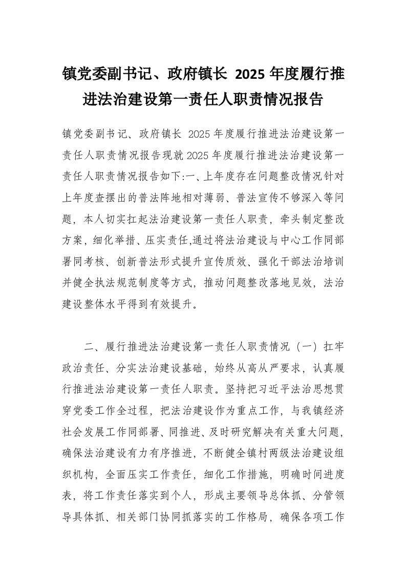 首页工作文档镇党委副书记、***镇长 2025年度履行推进法治建设第一责任人职责情况报告