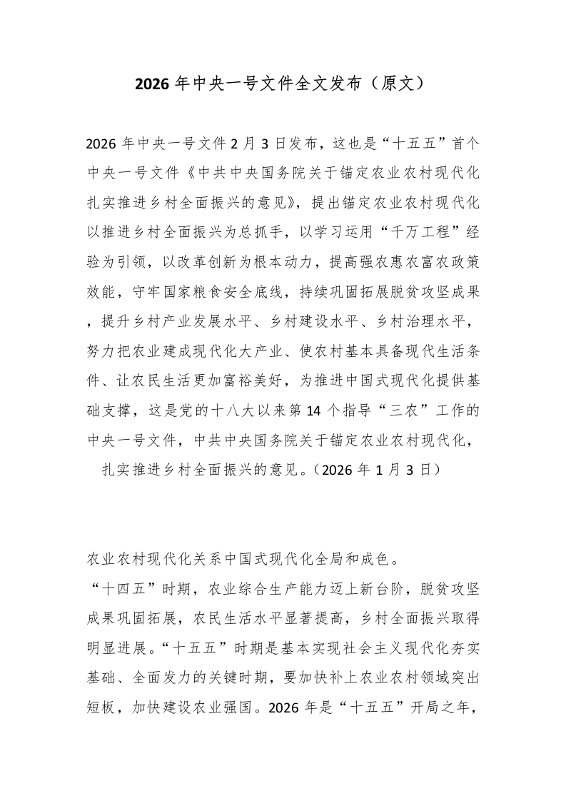 2026年中央一号文件全文发布(原文)_副本