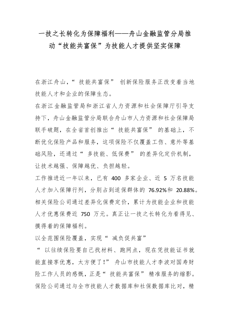 一技之长转化为保障福利——舟山金融监管分局推动“技能共富保”为技能人才提供坚实保障_副本