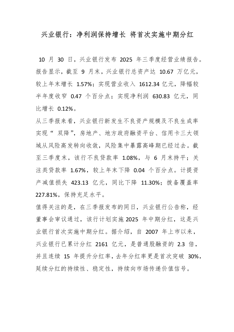兴业银行:净利润保持增长 将首次实施中期分红_副本