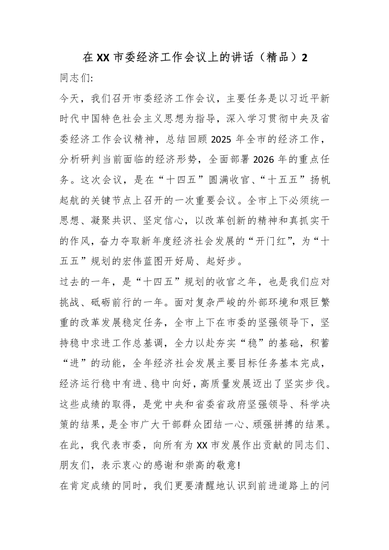 首页精选范文在XX市委经济工作会议上的讲话(精品)2_副本