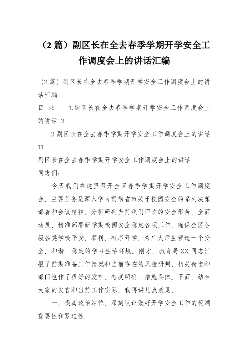 (2篇)副区长在全去春季学期开学安全工作调度会上的讲话汇编
