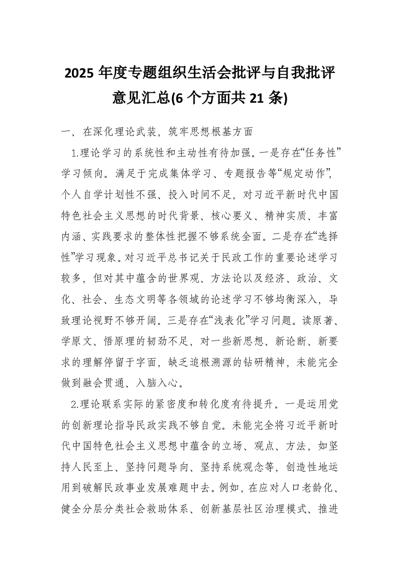 2025年度专题组织生活会批评与自我批评意见汇总(6个方面共21条)