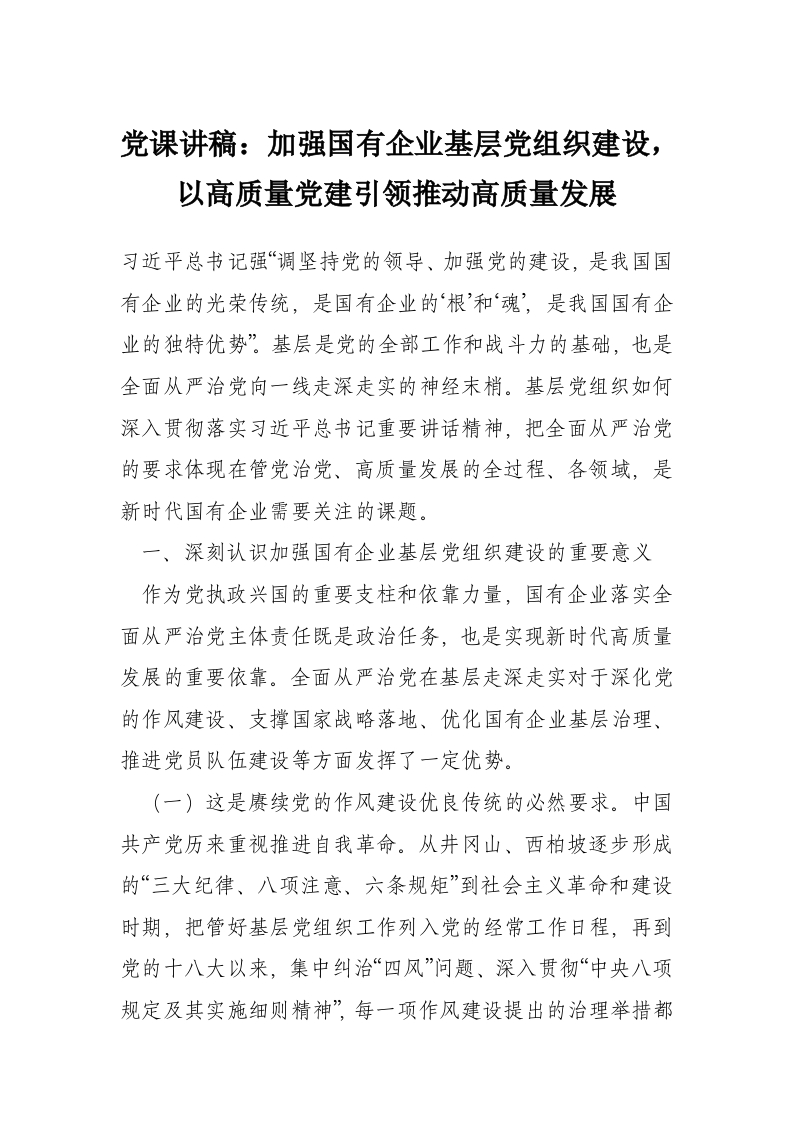 党课讲稿:加强国有企业基层党组织建设,以高质量党建引领推动高质量发展