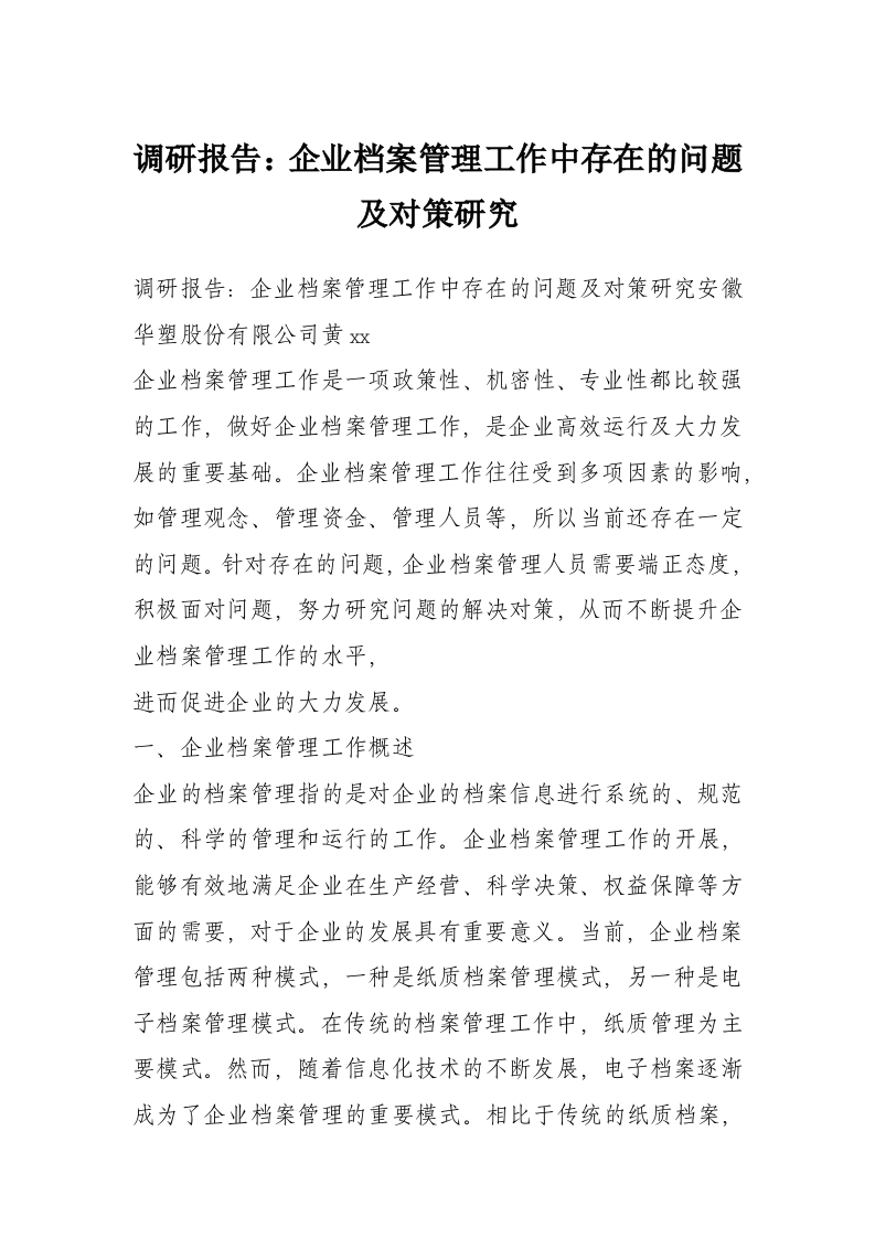 调研报告:企业档案管理工作中存在的问题及对策研究