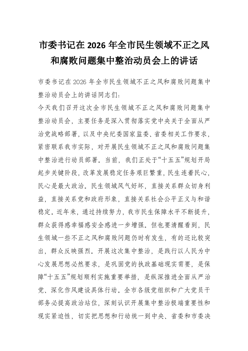 市委书记在2026年全市民生领域不正之风和腐败问题集中整治动员会上的讲话