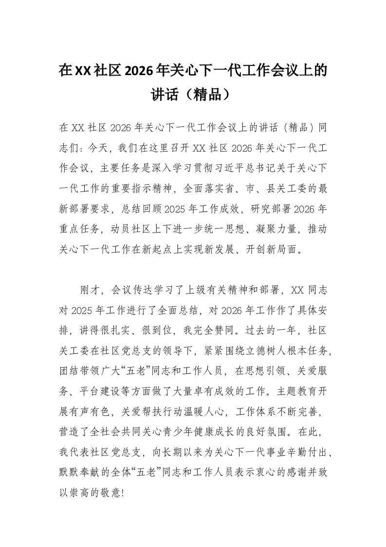 在XX社区2026年关心下一代工作会议上的讲话(精品)