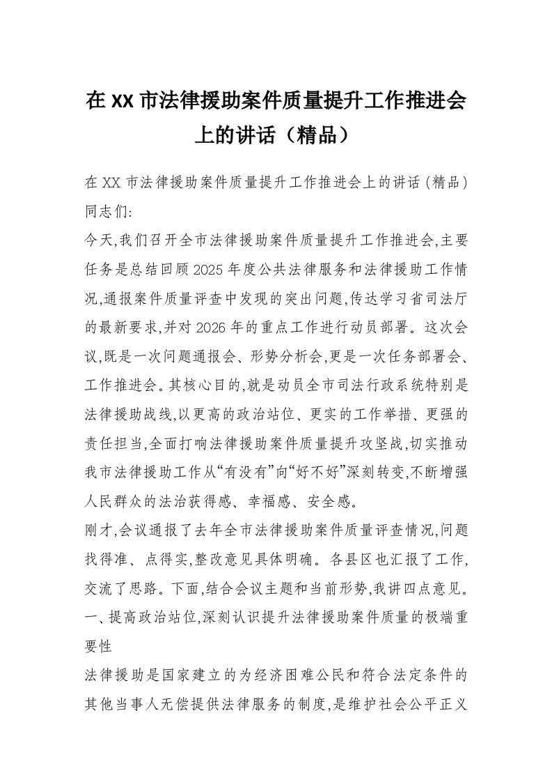 在XX市法律援助案件质量提升工作推进会上的讲话(精品)