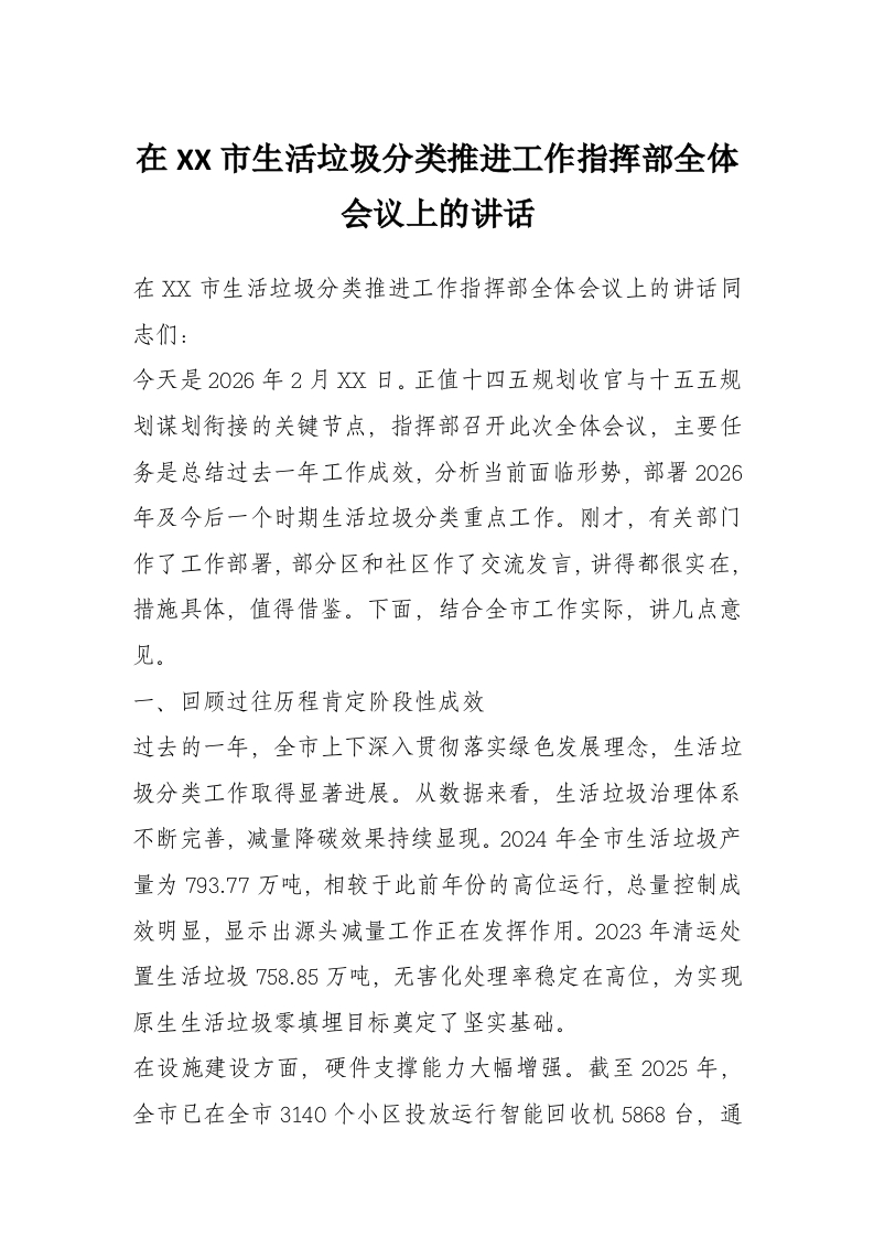 在XX市生活垃圾分类推进工作指挥部全体会议上的讲话