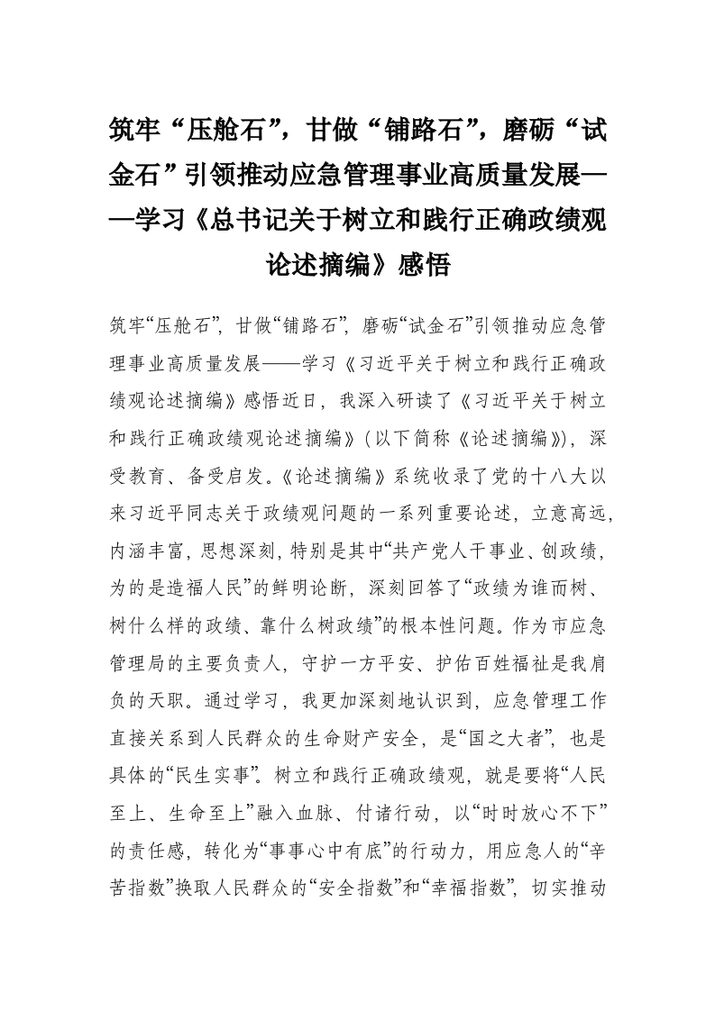 筑牢“压舱石”,甘做“铺路石”,磨砺“试金石”引领推动应急管理事业高质量发展——学习《总书记关于树立和践行正确政绩观论述摘编》感悟
