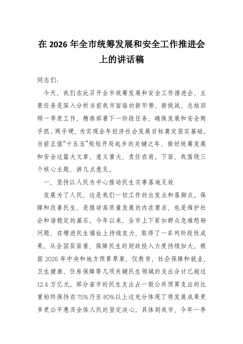首页工作文档在2026年全市统筹发展和安全工作推进会上的讲话稿