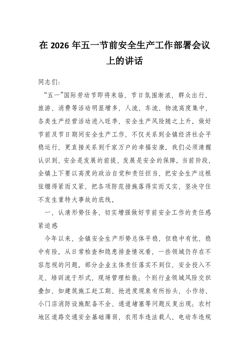 在2026年五一节前安全生产工作部署会议上的讲话